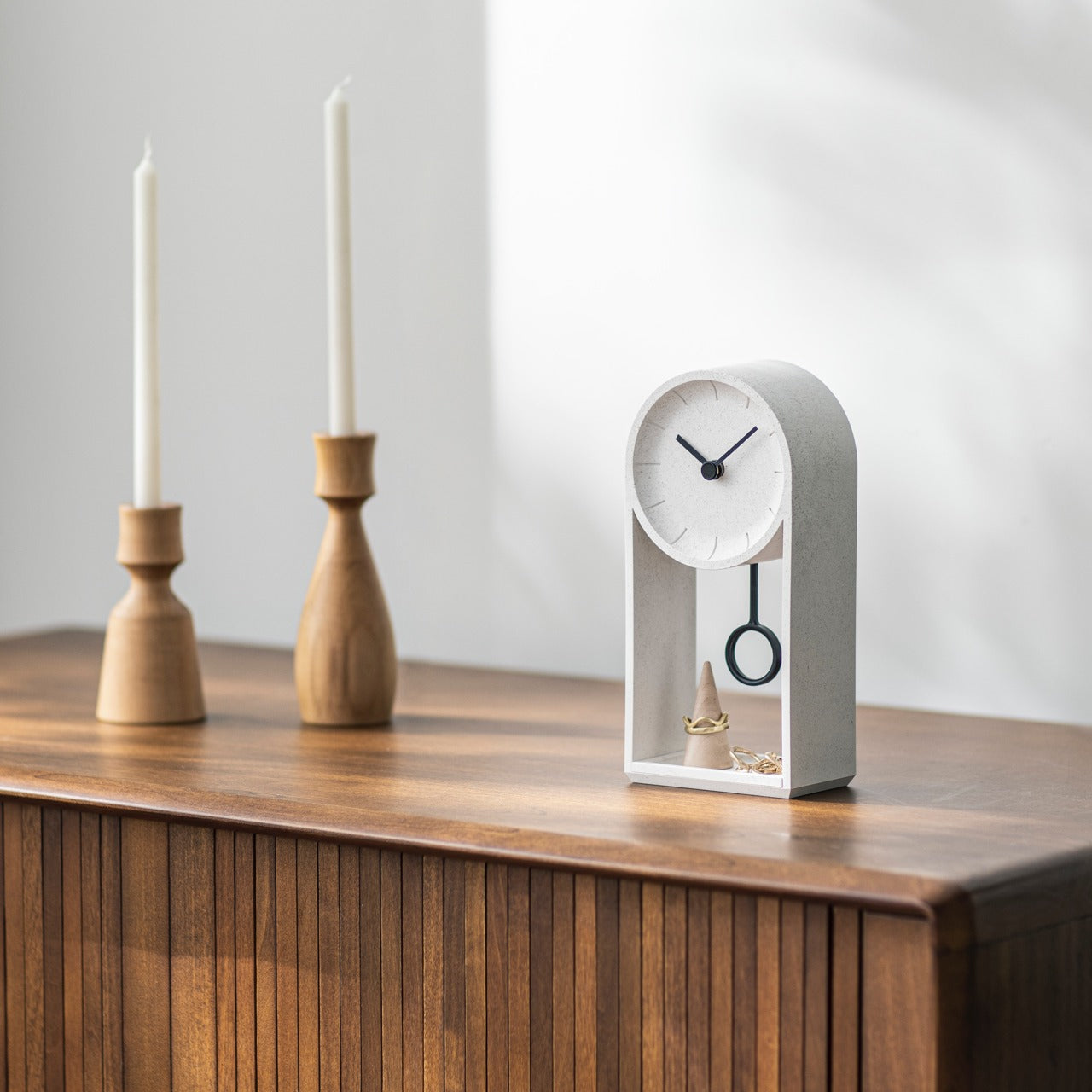 The Jewelry Display Clock solves two common issues in small homes – keeping track of time and organizing small accessories. This minimalist timepiece features a hollow center that provides the perfect display area for rings, earrings, and other small trinkets, transforming them from clutter into curated décor. The pendulum doubles as a hanging point for earrings, adding movement and visual interest to the display.