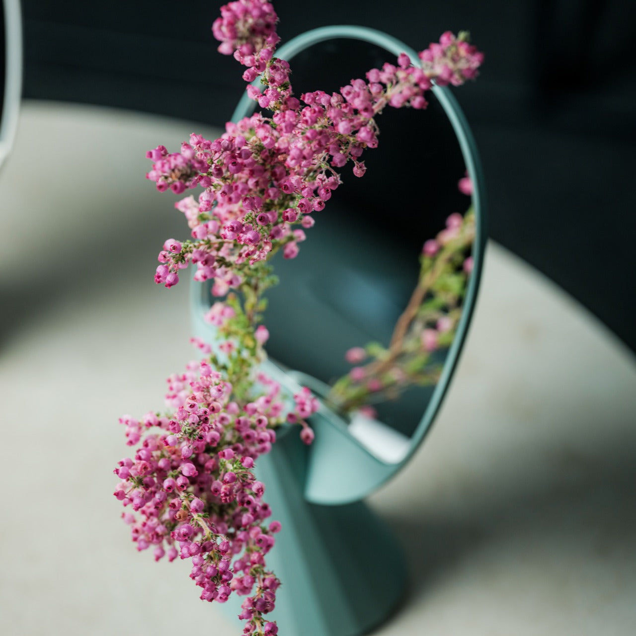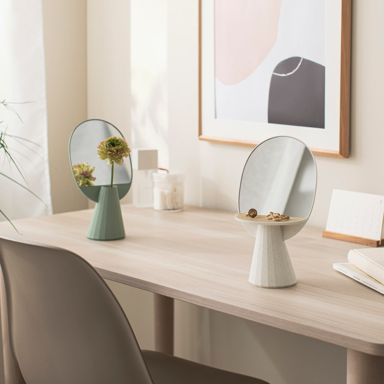 The Jewel Vase Mirror Stand combines three functions—reflection, display, and floral arrangement—into one striking piece. This innovative product features a uniquely shaped polyhedron mirror attached to a small vessel that can hold water for fresh flowers or serve as a catch-all for small accessories. Crafted from eco-friendly bioplastic containing rice husks, this piece brings sustainability to your décor while offering a warm, natural finish that will soften up your room.