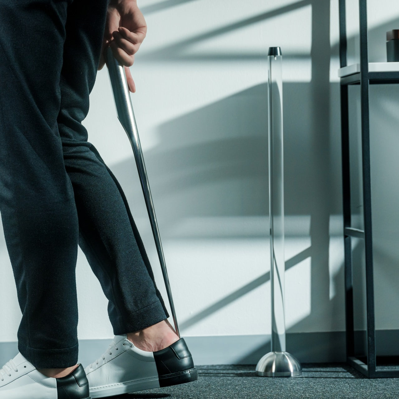 The Invisible Shoehorn transforms a utilitarian necessity into an elegant product that adds some sophistication to even the smallest entryway. This innovative product features a sleek, polished stainless steel body mounted on a transparent stand that creates the illusion of a floating metallic curve when not in use. The extended length allows users to slip on shoes without bending or straining, which is quite useful in cramped entryways where maneuvering can be tough.