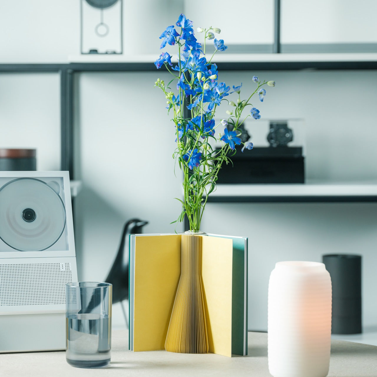 The Pop-Up Book Vase Edition 4 offers a creative and whimsical way to display floral arrangements. Opening the book reveals a 3D vase cutout, providing a dynamic platform for your flowers. It is made from 100% natural pulp, and this vase combines art and functionality, encouraging exploration of space and balance through its varied designs. It explores the Japanese principle of Ma by offering a unique and dynamic approach to floral arrangements.