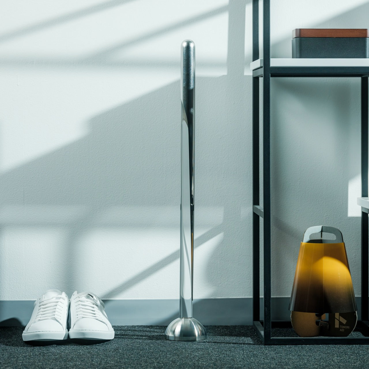 The Invisible Shoehorn combines functionality with aesthetics, seamlessly blending into your home’s décor. Its long, stainless steel body reduces strain on your lower back when putting on shoes, while the smooth, polished surface prevents snags in socks. When paired with its transparent stand, the shoe horn becomes an intriguing decorative piece that embodies naturalness and simplicity.