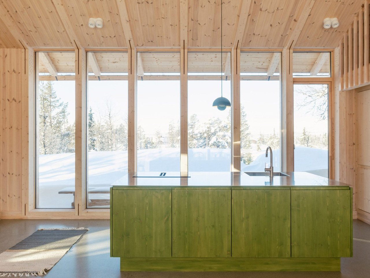 The home’s design prominently features an exposed wooden structure and cladding, highlighting the natural beauty of the materials used. Over time, the untreated pine planks on the exterior are intended to weather naturally, gradually transforming into a distinguished silver-grey hue that complements the surrounding landscape. Inside, the interiors are kept minimal to emphasize the simplicity and elegance of the design. To introduce subtle moments of color and interest, green-stained accents have been strategically incorporated. The kitchen counter, a key focal point within the space, along with the stairs, features this distinct green stain. These carefully chosen accents add vibrancy and contrast, creating visual interest while maintaining the overall sleek and minimal tone of the cabin’s interior design.